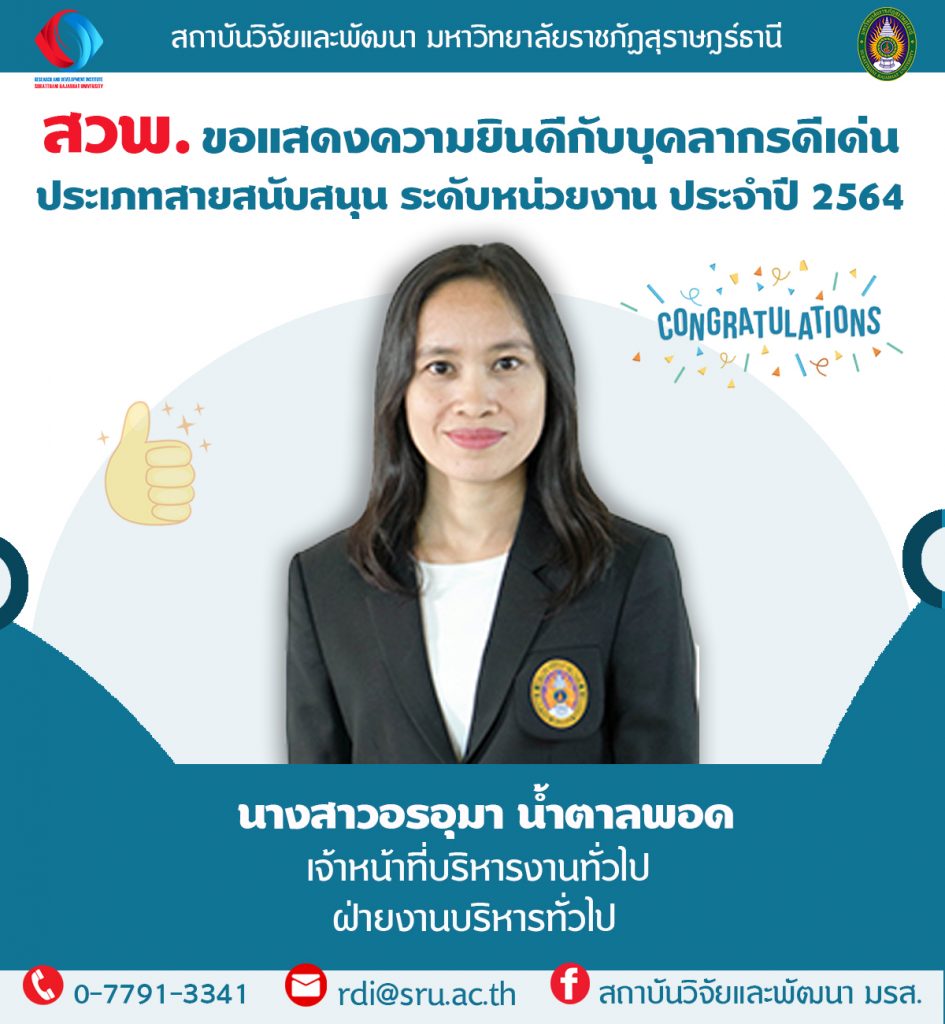 11 Feb 2022 chutinan ข่าวประชาสัมพันธ์ 🔊 สวพ. ขอแสดงความยินดีกับบุคลากรดีเด่น 💕 นางสาวอรอุมา น้ำตาลพอด เจ้าหน้าที่บริหารงานทั่วไป ฝ่ายงานบริหารทั่วไป 👉 ประเภทสายสนับสนุน ระดับหน่วยงาน ประจำปี 2564 ✌ Previous Article Next Article